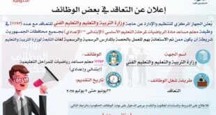 أعلن رئيس الجهاز المركزي للتنظيم والإدارة المهندس / حاتم نبيل عن حاجة وزارة التربية والتعليم والتعليم الفني للتعاقد مع عدد (١١٦٩٣) في وظيفة معلم مساعد مادة الرياضيات لمرحلة التعليم الأساسي (الإبتدائى – الإعدادي) بجميع محافظات الجمهورية، شريطة أن يكون المتقدم ممن تم الاستعانة بهم للعمل بالحصة بالمدارس الرسمية والرسمية لغات …