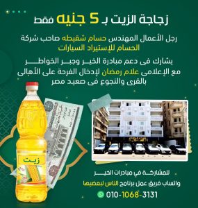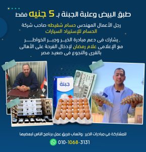 رجل الاعمال “حسام الدين شقيطه ” الشاب الذى تجول فى قرى ونجوع الصعيد وذلك من خلال مباردة الخير وجبر الخواطر , الذى من خلالها تم بيع الزيت والسكر والجبن وكرتونه البيض باسعار رمزية جدا ( 5 جنيهات )الامر الذى ادى التى توافد وازدحام عشرات الالاف من اهالينا بصعيد مصر