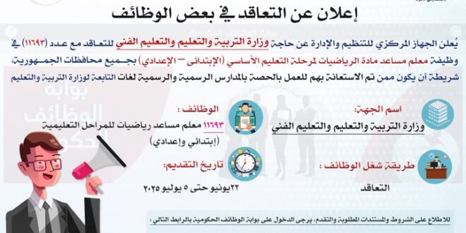 أعلن رئيس الجهاز المركزي للتنظيم والإدارة المهندس / حاتم نبيل عن حاجة وزارة التربية والتعليم والتعليم الفني للتعاقد مع عدد (١١٦٩٣) في وظيفة معلم مساعد مادة الرياضيات لمرحلة التعليم الأساسي (الإبتدائى – الإعدادي) بجميع محافظات الجمهورية، شريطة أن يكون المتقدم ممن تم الاستعانة بهم للعمل بالحصة بالمدارس الرسمية والرسمية لغات التابعة للوزارة.