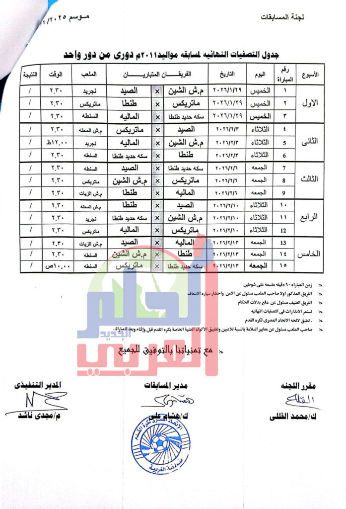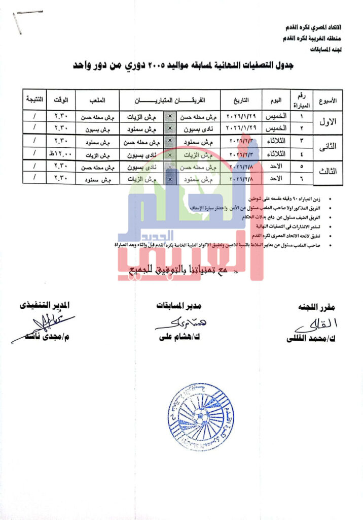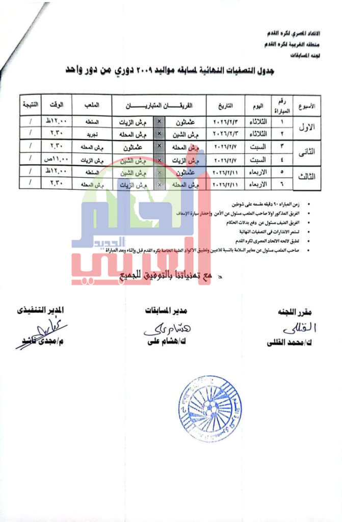 اعلنت منطقة الغربية لكرة القدم برئاسة المهندس مجدى ناشد عن تحديد موعد وانطلاق مباريات التصفيات النهائية لمنطقة الغربية لكرة القدم مواليد 2011/ 2009/2007/2005 على ان تقام المباريات من دور واحد .