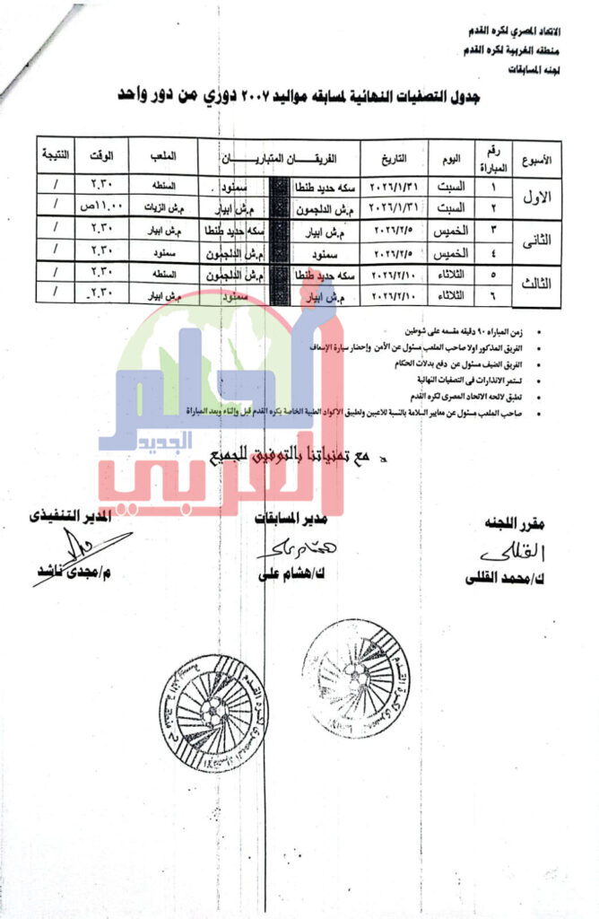 وتقام هذه المباريات تحت اشراف منطقة الغربية لكرة القدم برئاسة المهندس مجدى ناشد ومدير المسابقات كابتن هشام على ومقرر اللجنة الكابتن محمد القللى