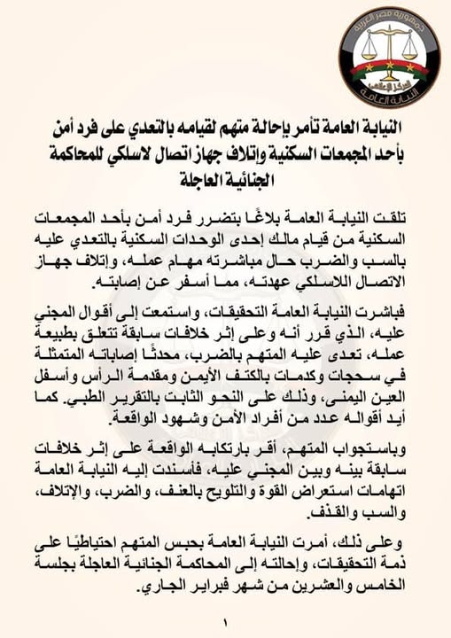 اصدرى النيابة العامة بيانا منذ دقائق بإحالة قضية ضرب موظف أمن بالتجمع الخامس الى المحكمة الجنائية , وذلك بعد الانتهاء من كافة التحقيقات .